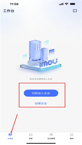 1、工作臺界面,可掃碼加入企業或創建企業,用戶未創建或加入企業時展示該界面,助力企業成員管理和企業創建。