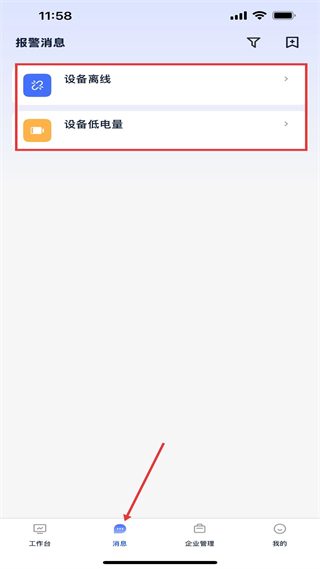 2、消息界面,展示報警消息,有設備離線、設備低電量分類,方便用戶及時了解設備狀態,處理設備異常。