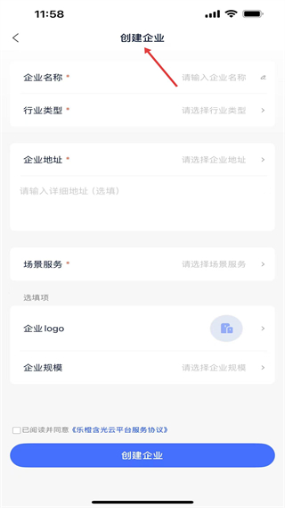 3、創建企業界面,需填寫企業名稱、行業類型等信息,同意服務協議后可創建企業,為企業管理提供基礎信息錄入。