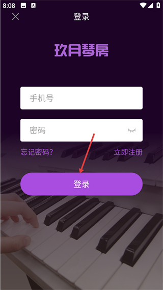 1、進入玖月琴房登錄頁,輸入手機號與密碼即可登錄,也可選擇忘記密碼或立即注冊,是賬號使用的入口。