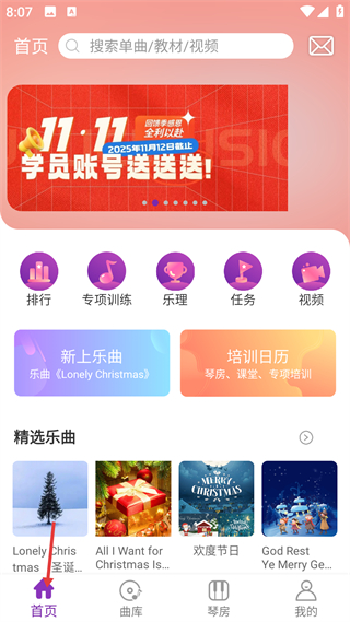 2、打開首頁,使用排行、樂理等功能,查看新上樂曲與精選曲目,是音樂學習資源的綜合展示頁面。