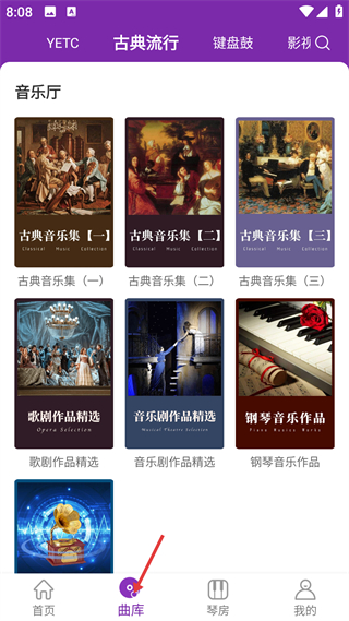 3、進入曲庫頁面,查看古典流行等分類的音樂集,涵蓋不同風格的音樂作品,是曲譜資源的分類導航頁。