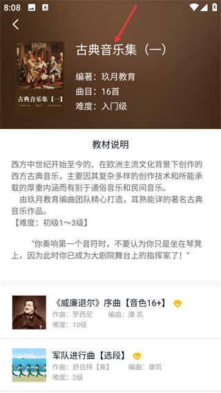 4、查看古典音樂集一詳情,了解其含16首入門級曲目,配備教材說明,展示具體樂曲的難度與編曲信息。