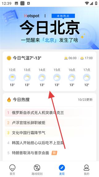 1、進入發現板塊可查看今日北京的天氣信息,氣溫的變化,以及今日熱搜內容,了解熱點資訊。
