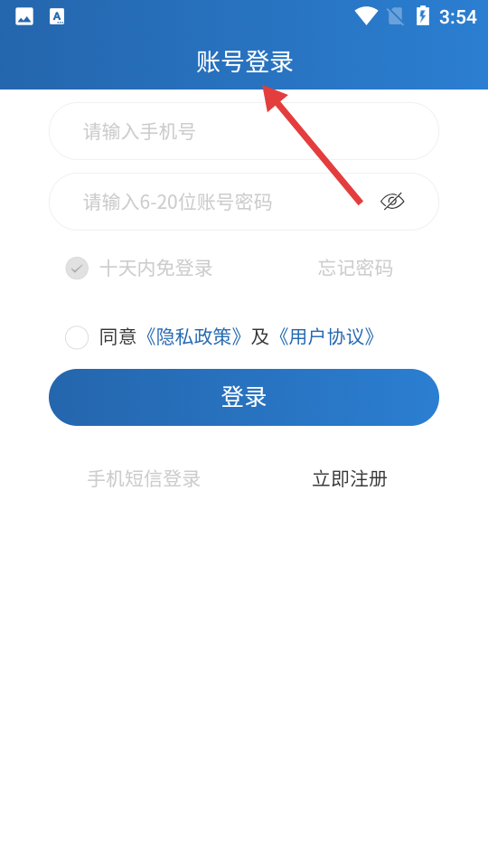 1、點擊賬號登錄頁,以藍色為主,需輸入手機號與6、20位密碼,提供十天內免登等功能,還有協議勾選要求。