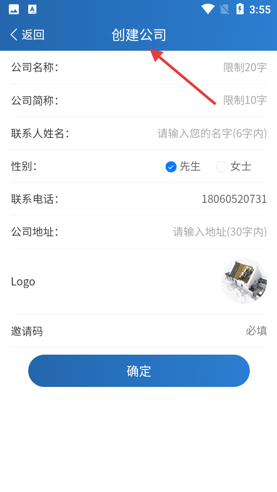 2、點擊創建公司界面,可填寫公司名稱等信息,涵蓋聯系人、電話、地址等字段,Logo可添加,邀請碼為必填項。