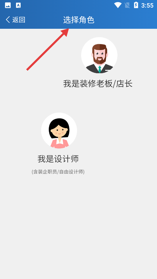 3、點擊角色選擇頁面,清晰展示我是裝修老板店長與我是設計師兩種角色,助力用戶快速定位身份。