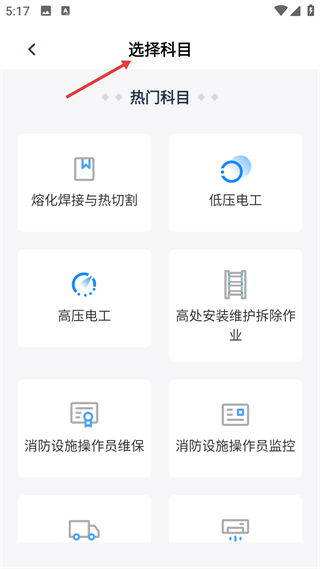 1、進入應用先看到選擇科目界面,熱門科目包含熔化焊接與熱切割低壓電工高壓電工等選項,點擊對應的科目卡片,即可進入該科目專屬的備考練習模塊。
