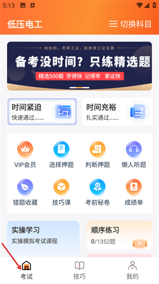 2、進入低壓電工科目界面,能看到時間緊迫時間充裕兩種備考模式,還有VIP會員選擇押題判斷押題等功能按鈕,可按需選擇功能開展備考練習。