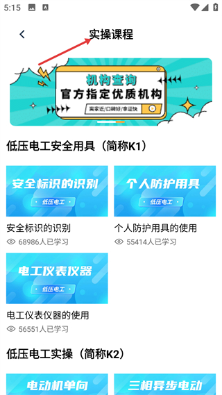 3、進入實操課程模塊,可看到低壓電工安全用具相關的學習內容,包含安全標識識別個人防護用具使用等課程,點擊對應課程即可開始學習。