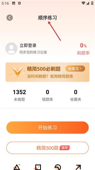 4、進入順序練習界面,可看到未做題數量錯題庫等數據,有開始練習和精簡500題兩個選項,登錄賬號后同步練習記錄,點擊按鈕開始刷題練習。