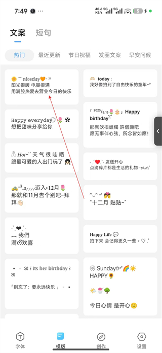 1、進入文案短句頁面,選擇熱門分類下的目標文案,點擊進入該文案的詳情頁面,查看文案的具體內容。