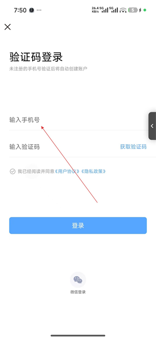 4、在驗證碼登錄頁面,輸入手機號,點擊獲取驗證碼并填入,勾選已閱讀并同意相關協議,完成登錄。
