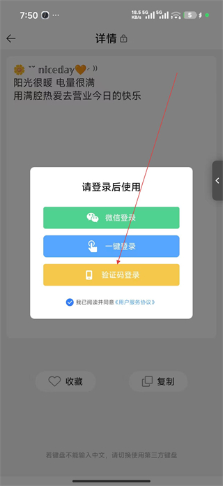 3、點擊收藏或復制按鈕,觸發登錄提示彈窗,選擇驗證碼登錄選項,進入登錄頁面。