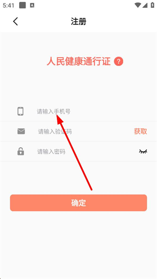 4、進入注冊頁面,依托人民健康通行證,先輸入手機號,獲取并填寫驗證碼,再設置對應密碼,確認信息無誤后,點擊確定按鈕完成注冊操作。