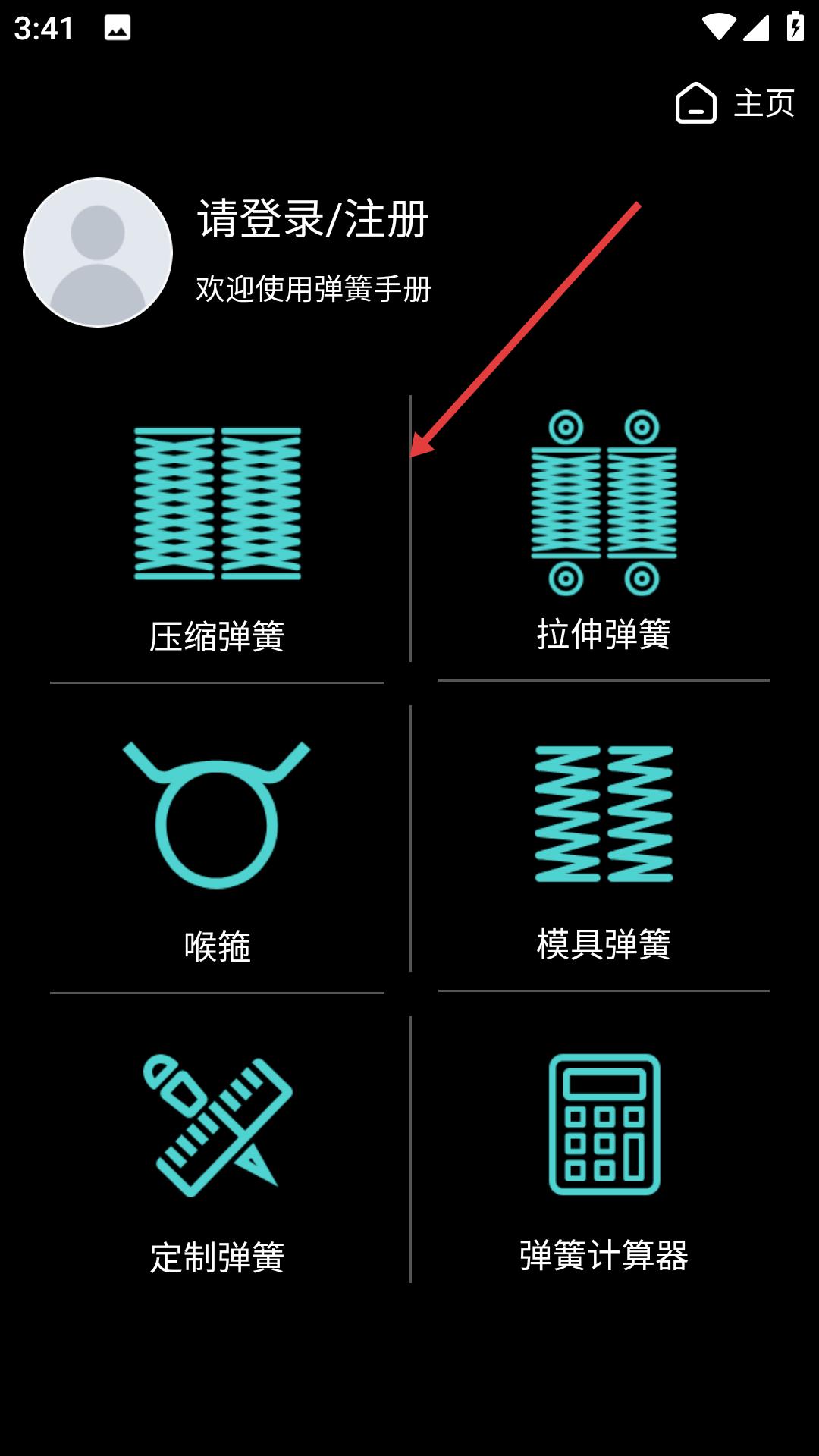 1、彈簧手冊APP首頁有壓縮彈簧、拉伸彈簧等多種彈簧類型及喉箍、彈簧計算器等功能選項,登錄注冊后可使用各項功能。
