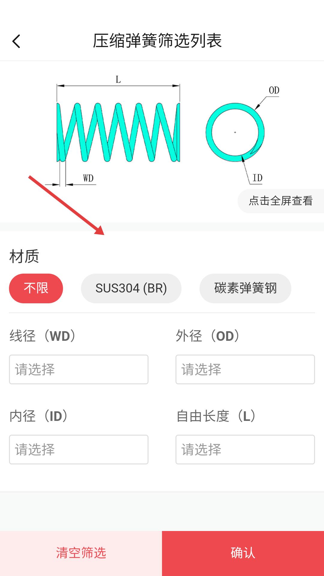 壓縮彈簧篩選列表,用戶可以根據材質,輸入外徑、線徑、內徑、自由長度、壓縮后高度、密身高度、力度、彈簧剛度任意一項或多項數據篩選出對應的壓縮彈簧。