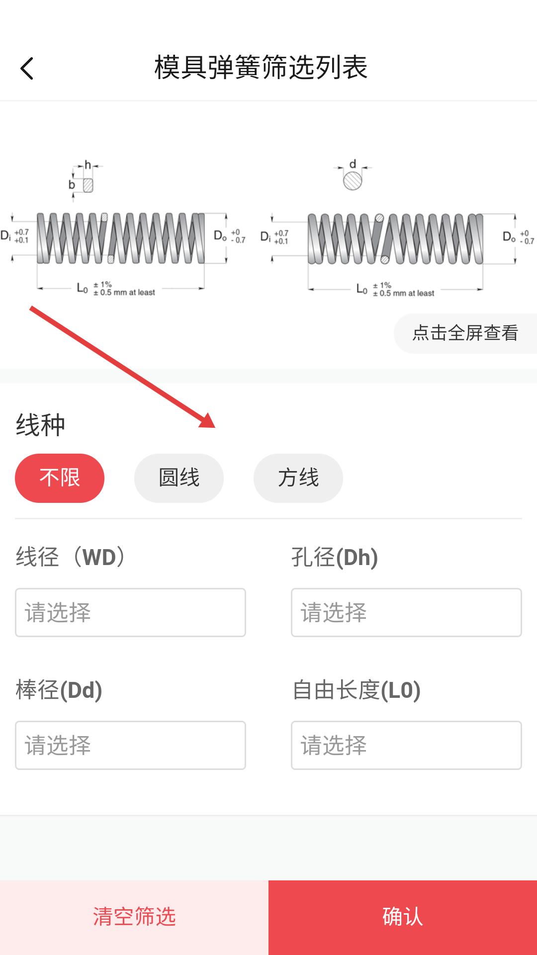 3、模具彈簧篩選列表中,線種可選圓線、方線,同時可設置線徑、孔徑等參數,方便用戶篩選符合需求的模具彈簧。