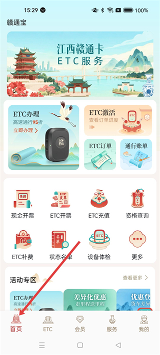 1、進入首頁,可辦理ETC、激活ETC、查看訂單和通行賬單等,還能進行開票、充值、資格查詢等操作,享受多樣ETC服務。