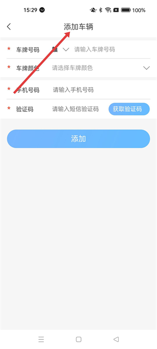 4、添加車輛頁面,輸入車牌號碼、選擇車牌顏色、填寫手機號碼并獲取驗證碼,完成后點擊添加,即可添加車輛信息。