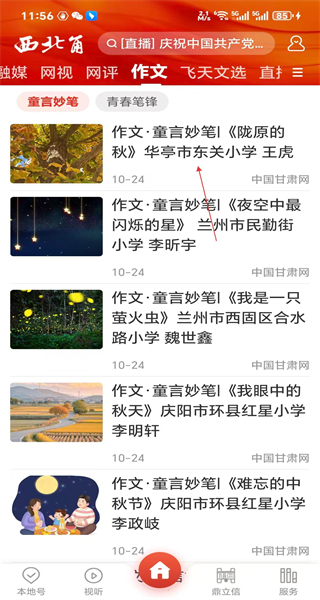 1、打開西北角軟件,進入作文板塊,瀏覽童言妙筆的隴原的秋作文資訊,了解華亭市東關小學學生的寫作內容。