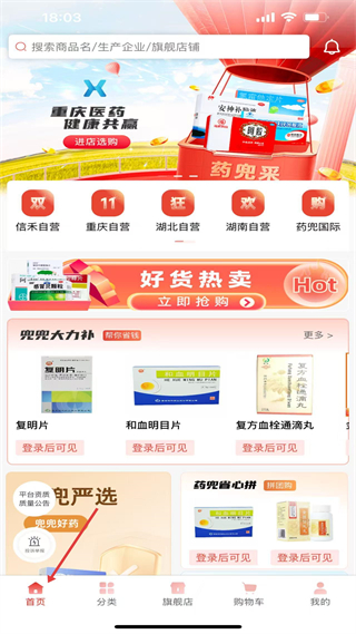 1、首頁,有搜索欄,展示重慶醫藥進店入口,好貨熱賣、兜兜大力補板塊展示復明片等藥品,需登錄看詳情。