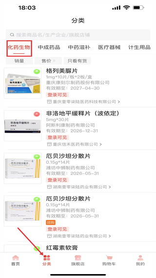 2、分類頁化藥生物,展示格列美脲片、非洛地平緩釋片等藥品,標注規格、企業、有效期,需登錄看價格。