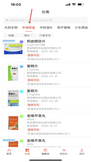 3、分類頁中成藥品,展示和血明目片、復明片等藥品,標注規格、企業、有效期,部分為醫保品種,需登錄看價格。