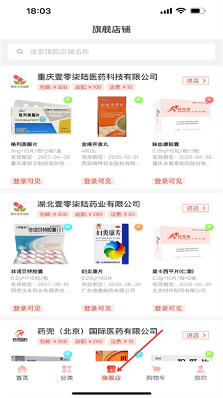 4、旗艦店頁,展示重慶、湖北壹零柒陸等旗艦店鋪,各店展示格列美脲片、金嗓開音丸等藥品,標注規格、有效期,需登錄看價格。