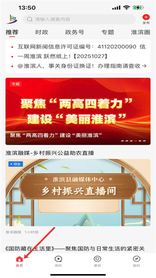 1、首頁,有推薦、時政等新聞分類,展示淮濱本地時政、民生及鄉村振興直播預告等資訊,方便用戶了解地方動態。