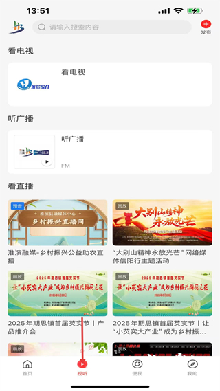 2、視聽板塊,有看電視、聽廣播、看直播功能,含鄉村振興助農直播、地方活動直播回放等內容,豐富用戶視聽體驗。