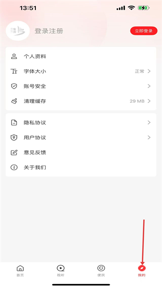 4、我的板塊,可登錄注冊,管理個人資料、賬號安全,設置字體大小、清理緩存,還能查看隱私協議等,滿足賬戶管理需求。