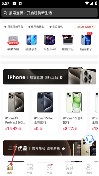 1、首頁,有搜索欄和蘋果專區等分類,展示iPhone租賃價格,底部是首頁等功能按鈕,可快速進入各板塊。