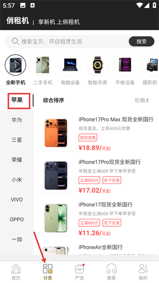 2、分類頁面,按設備和品牌劃分,蘋果分類下有iPhone17系列,標注日租價和立減優惠,方便篩選心儀機型。