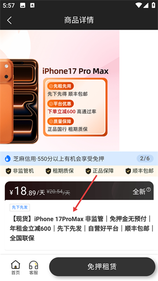 3、商品詳情頁,展示iPhone17 Pro Max,說明先租先用等優勢,日租價18.89元,有免押和順豐包郵等服務。