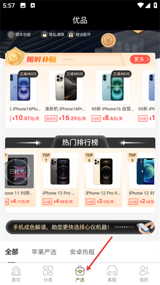 4、嚴選頁面,含限時補貼和熱門排行,展示二手優品價格,標注成色,可選蘋果嚴選等分類,性價比突出。