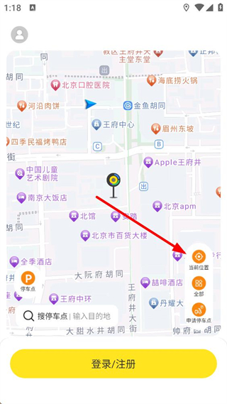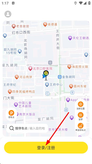 1、進入小黃鴨出行的地圖頁面,能看到當前位置的周邊信息,底部設有登錄、注冊按鈕,點擊該按鈕進入登錄頁面。
