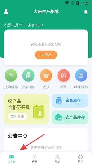 1、點擊工作臺,顯示農場地塊狀態,集成種養、操作、銷售等功能,公告中心暫無更新。