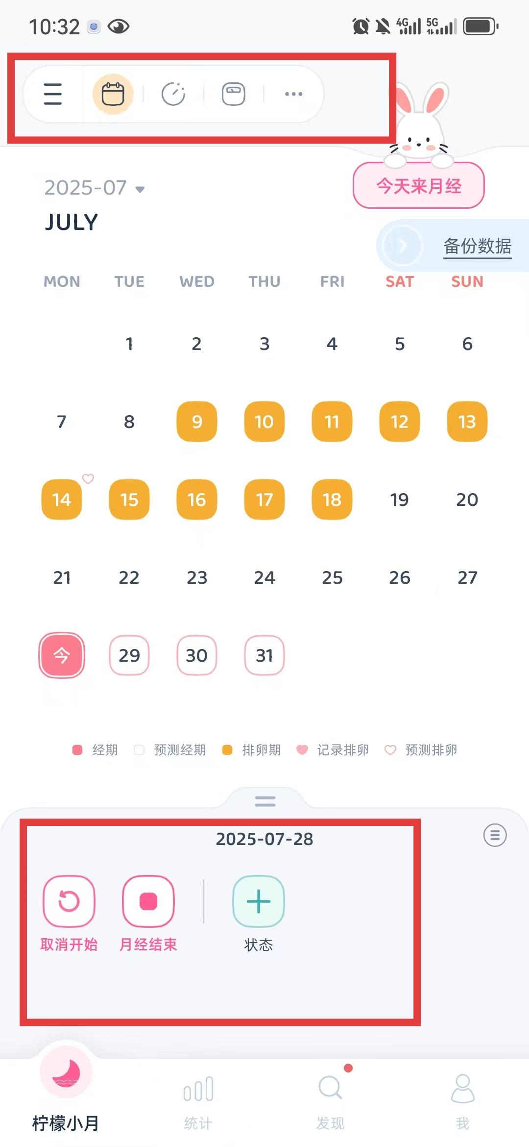 1、主界面上方有功能圖標欄,下方是日期顯示區,點擊今天來月經可記錄經期起始,下方取消開始、月經結束能精準標記經期時長,狀態可添加經期身體狀況等細節。