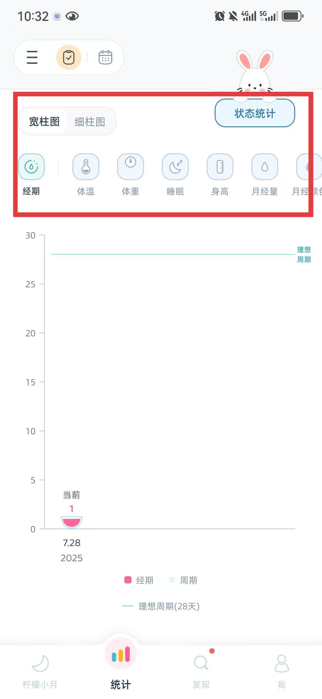 2、統計頁面能查看經期、體溫等多維度數據統計,通過寬柱圖、細柱圖切換不同圖表樣式,狀態統計按鈕可匯總各類記錄數據,輔助分析身體變化趨勢、提供數據支撐。