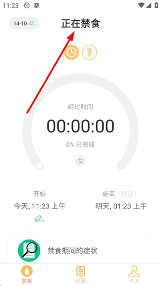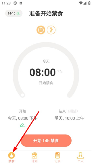 1、進入禁食界面,可查看準備開始禁食的時間,設置開始和結束期望時間,點擊開始14h禁食按鈕即可啟動禁食計劃,底部有禁食、計劃、記錄、個人導航選項。