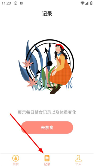 3、點擊底部記錄選項,進入記錄界面,可查看每日禁食記錄以及體重變化,點擊去禁食按鈕可返回禁食界面繼續管理禁食計劃。