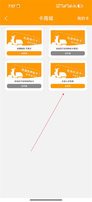 3、在卡商城頁面瀏覽展示的各類卡片,選擇想要辦理的卡片如外賣專用卡,點擊該卡片對應的去購買按鈕,進入該卡片的詳情辦理頁面。