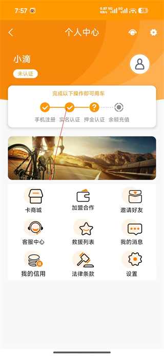 2、登錄后進入個人中心頁面查看已完成的認證步驟,瀏覽頁面中的功能選項,找到卡商城入口,點擊該入口進入卡商城頁面,查看各類卡片信息。