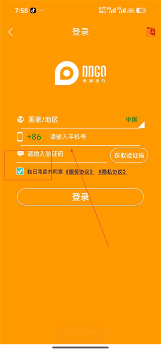1、打開電滴出行app,進入登錄頁面,選擇對應國家地區,點擊手機號輸入框填寫號碼,點擊獲取驗證碼,輸入驗證碼并勾選同意協議,點擊登錄按鈕完成登錄。
