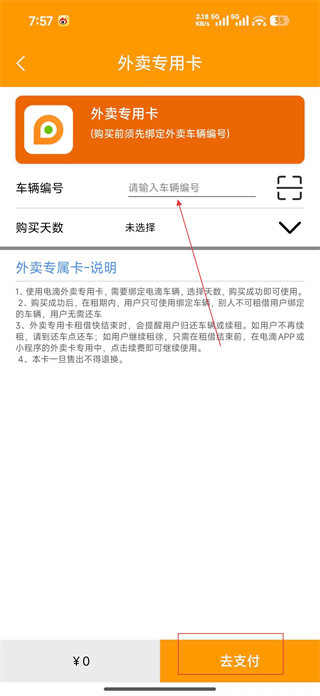 4、在卡片詳情頁面點擊車輛編號輸入框填寫對應編號,選擇購買次數,閱讀卡片說明后,點擊去支付按鈕完成購買。