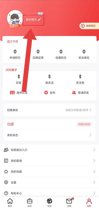 1、我的頁面,頂部有我的簡歷入口,可點擊編輯,下方展示近三個月求職相關數據統計,如申請職位等。