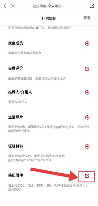 2、簡歷編輯界面,設有家庭成員、自我評價等板塊,紅框處簡歷附件功能,支持上傳多種格式文件,方便求職者補充相關材料。