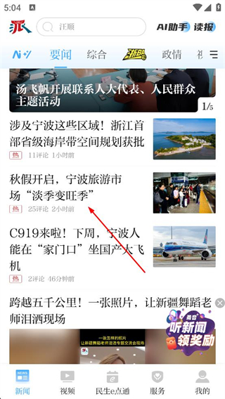 1、打開甬派APP,進入新聞頁面,可看到要聞、綜合等多個新聞分類,還有各類新聞列表,點擊感興趣的新聞。