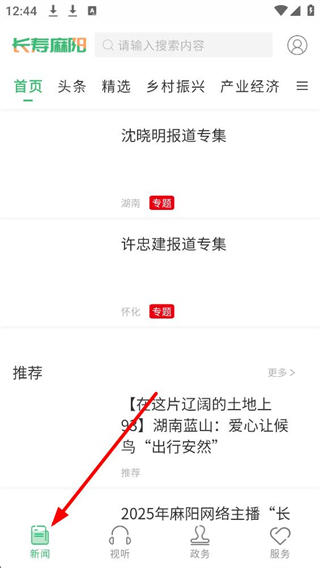 1、打開長壽麻陽APP,進入新聞界面,可看到首頁、頭條等欄目,展示多條本地新聞資訊,點擊右上角個人圖標進入個人界面。